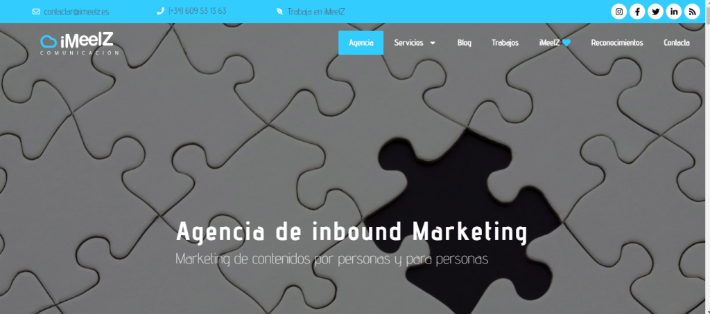 iMeelZ se presenta como una agencia de marketing digital en Tenerife y Málaga especializada en diseño web, aplicaciones y tiendas online. Destacan como la Nº 1 en inbound marketing, ofreciendo estrategias de marketing de contenidos bajo la metodología inbound. Además, se posicionan como una agencia de publicidad que gestiona campañas digitales con objetivos de conversión y una agencia de comunicación que elabora estrategias, diseño de mensajes y difusión realizada por profesionales especializados.